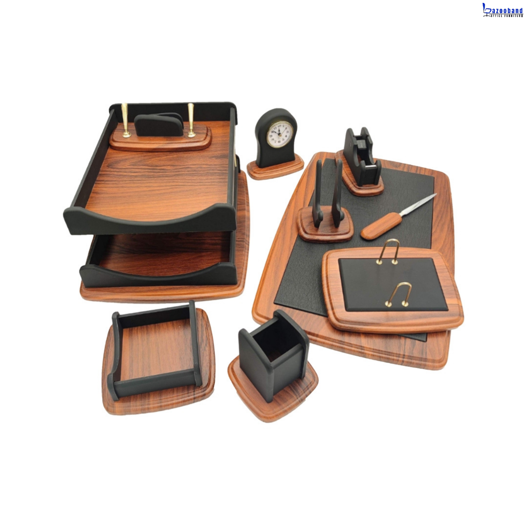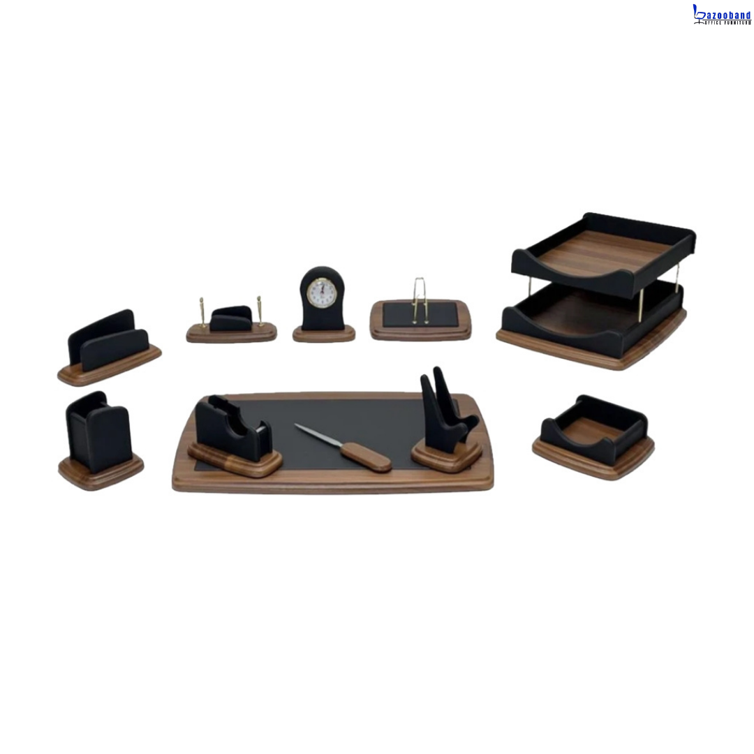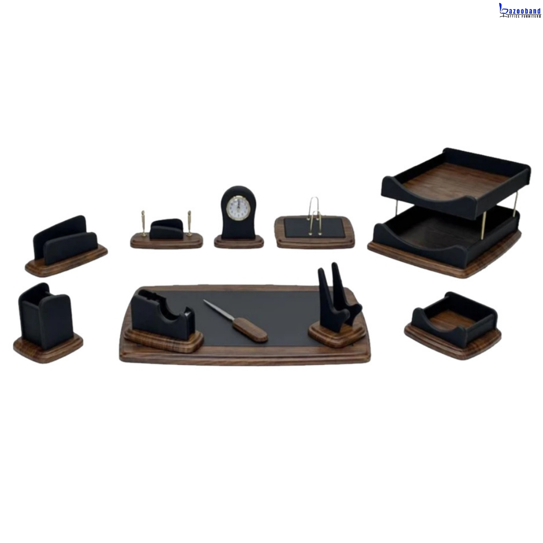 🔻زیردستی با طول 55 و عرض 35 سانتیمتر 🔻کازیه دو طبقه 🔻استند تقویم رومیزی 🔻پایه ی روان نویس 🔻جای پاکت نامه 🔻جای کاغذ یادداشت 🔻جاکارتی 🔻جامدادی لیوانی 🔻پایه چسب 🔻پاکت بازکن 🔻ساعت رومیزی
