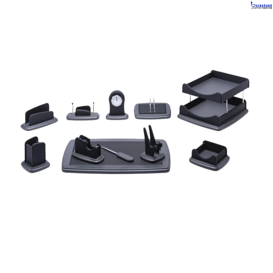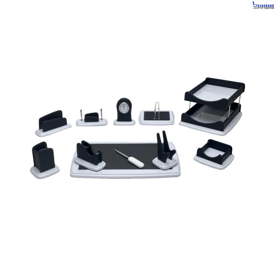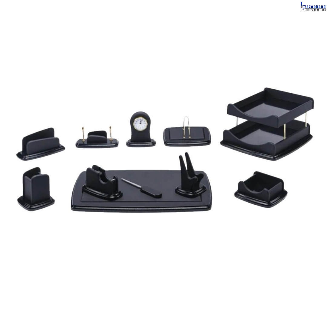 🔻زیردستی با طول 55 و عرض 35 سانتیمتر 🔻کازیه دو طبقه 🔻استند تقویم رومیزی 🔻پایه ی روان نویس 🔻جای پاکت نامه 🔻جای کاغذ یادداشت 🔻جاکارتی 🔻جامدادی لیوانی 🔻پایه چسب 🔻پاکت بازکن 🔻ساعت رومیزی